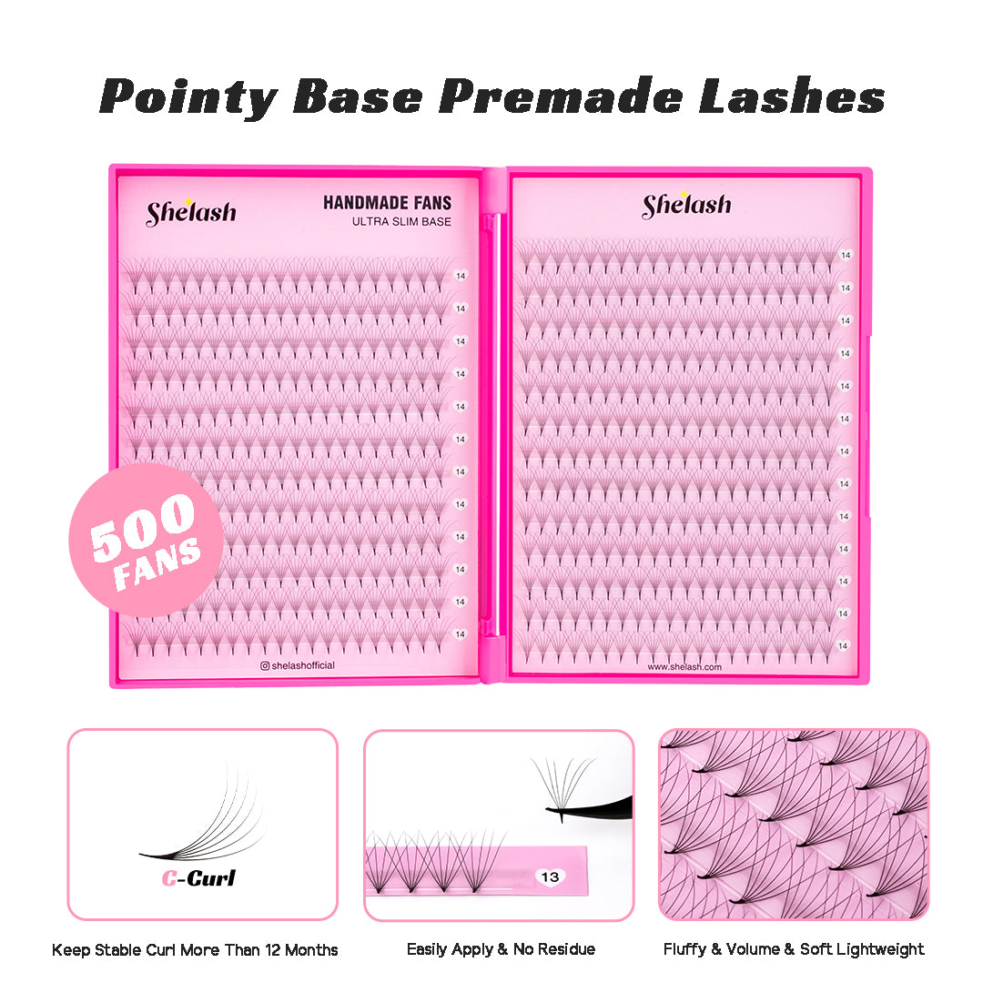 These 6D Pointy Base Handmade Premade Volume 500 Fans are the perfect solution for lash artists looking to save time.These fans can be easily applied to clients' eyes to create a beautiful, luscious look. Shelash 6D Pointy Base Handmade Premade Volume 500 Fans provide a professional, personalizable Mega Volume look with dense, matte black styling. Ideal for your clients, they bring a luxury look and high-quality look to your salon.